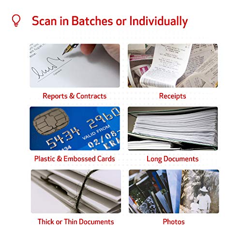 Reliably handles many different document types: Receipts, photos, business cards, plastic or embossed cards, reports, contracts, long documents, thick or thin documents, and more