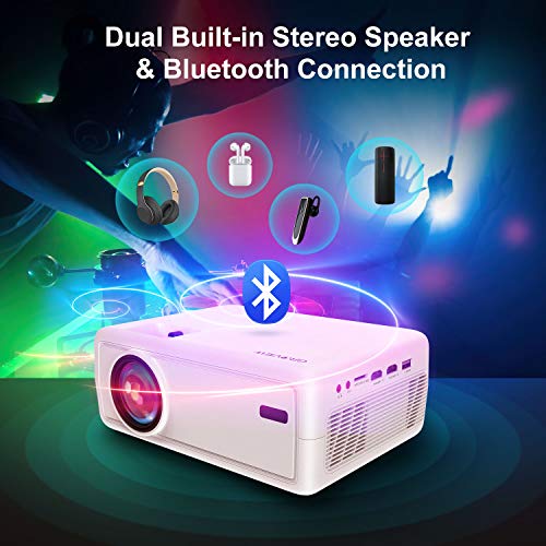 【DUAL STEREO SPEAKERS & BLUETOOTH 5.0 FUNCTION】This Movie projector has built-in 3W dual stereo speakers with SRS sound system, which you can get the superior sound experience from this portable mini projector. With Bluetooth 5.0 Function, you can connect your ideal Bluetooth speakers wirelessly at any time.